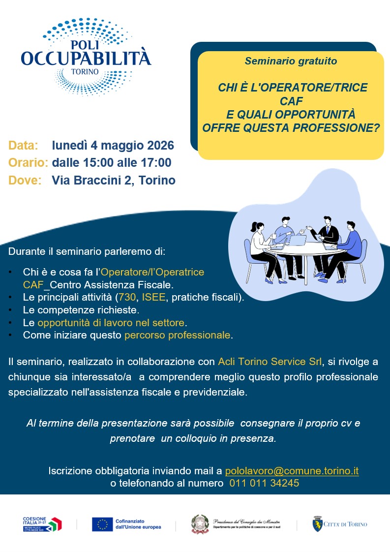 Iscrizione obbligatoria inviando mail a pololavoro@comune.torino.it  o telefonando al numero 011 011 34245