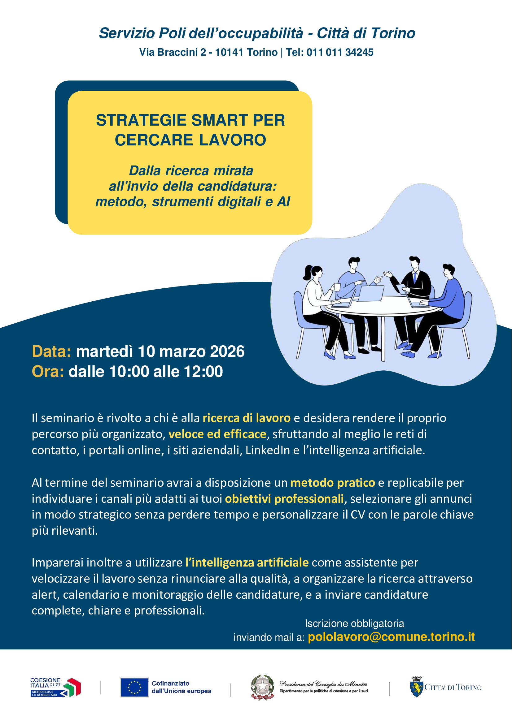 Il seminario è rivolto a chi è alla ricerca di lavoro e desidera rendere il proprio percorso più organizzato, veloce ed efficace, sfruttando al meglio le reti di contatto, i portali online, i siti aziendali, LinkedIn e l’intelligenza artificiale.Al termine del seminario avrai a disposizione un metodo pratico e replicabile per individuare i canali più adatti ai tuoi obiettivi professionali, selezionare gli annunci in modo strategico senza perdere tempo e personalizzare il CV con le parole chiave più rilevanti. Imparerai inoltre a utilizzare l’intelligenza artificiale come assistente per velocizzare il lavoro senza rinunciare alla qualità, a organizzare la ricerca attraverso alert, calendario e monitoraggio delle candidature, e a inviare candidature complete, chiare e professionali.